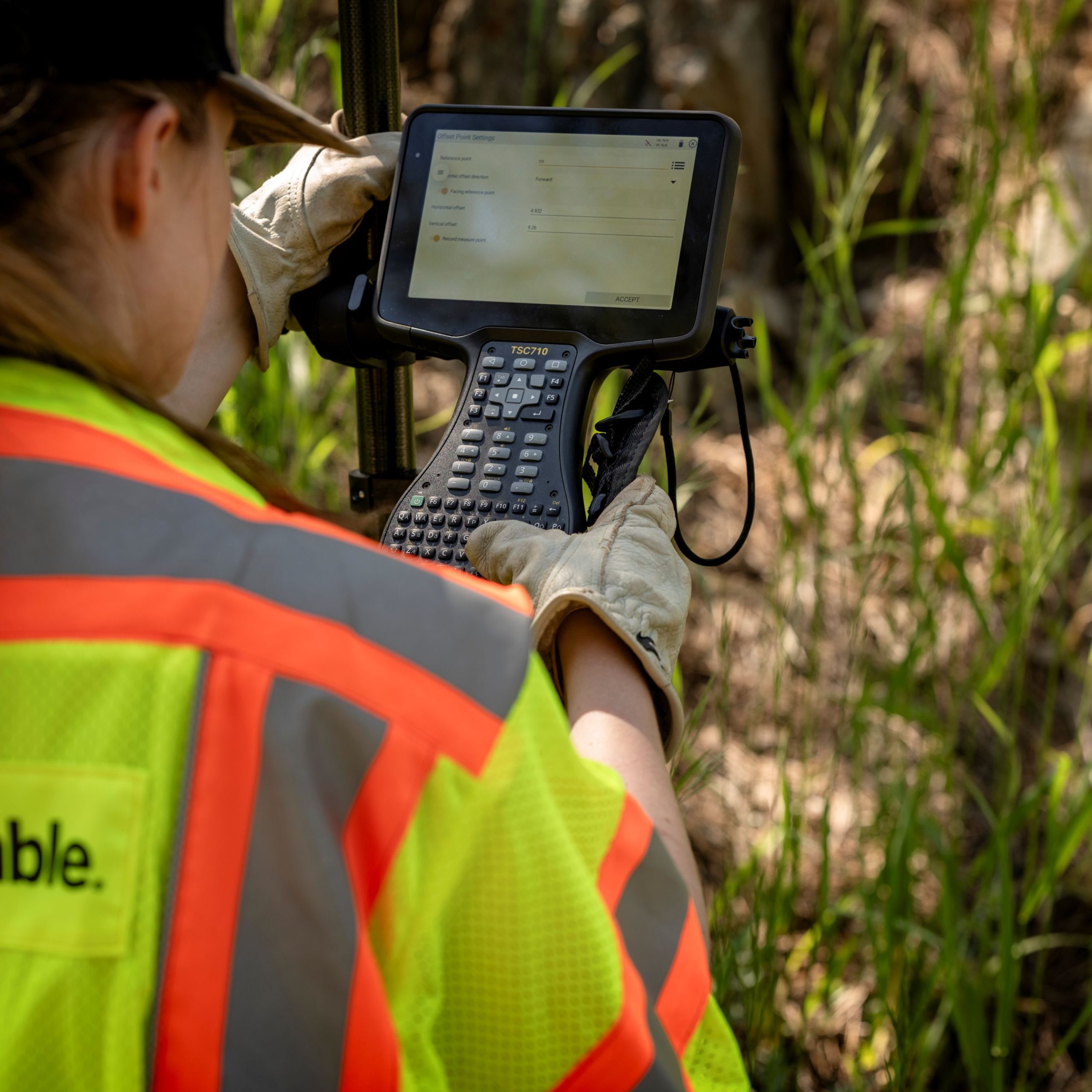 De Trimble TSC710 controller is een draadloze en solide handheld bedieningseenheid voor gebruik met GNSS of een total station. Hij geeft landmeters in de bouw, maatvoerders